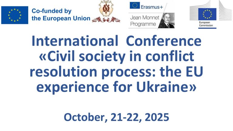 Dear colleagues! We invite you to participate in the international conference “Civil Society in Conflict Resolution Process: EU Experience for Ukraine” within the framework of the Jean Monnet project “Civil Society in Conflict Resolution: EU Experience for Ukraine” (101084973 –…