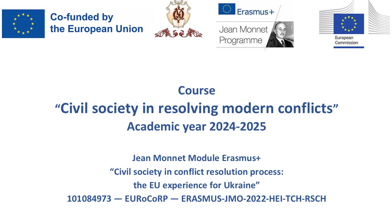 We would like to remind you that the project “Civil Society in Conflict Resolution Process: EU Experience for Ukraine” (101084973 — EURoCoRP — ERASMUS-JMO-2022-HEI-TCH-RSCH) is being implemented by the National University of Ostroh Academy with co-financing from the European Union and aims to promote the values of EU civil society in the process of conflict resolution and raise awareness of contemporary hybrid conflicts.